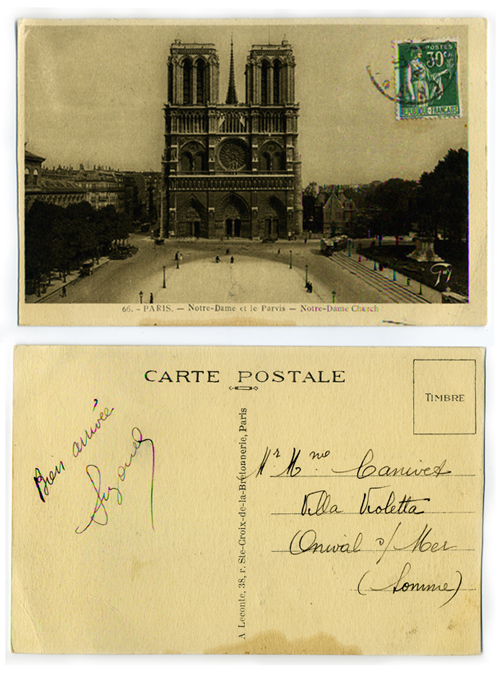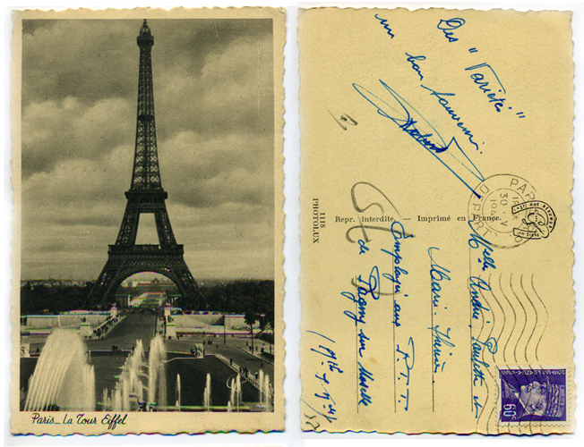 在巴黎北邊的跳蚤市場挑的明信片背後有著陳年的字跡正面的艾菲爾鐵塔和聖母院可以看到巴黎變遷的縮影聖母院廣場旁過去還有輕軌電車呢這次短短幾天時間很匆促下次再好好的去尋寶 從郵戳和郵票看起來 這張應該是1940年代戴高樂掌政時期的巴黎